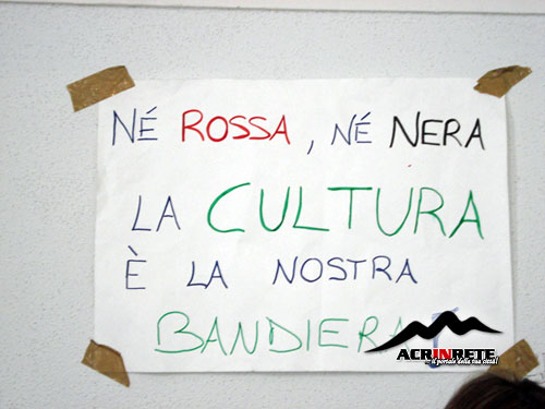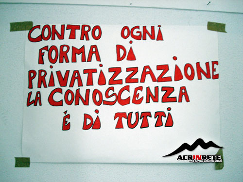 La scuola, e soprattutto la cultura, è per tutti, non può essere privatizzata perchè ogni cittadino di una Repubblica libera deve poter avere un'istruzione gratuita indipendentemente dal suo conto in banca. E così ci siamo ritrovati a discutere in un dibattito, esprimendo le nostre idee, cercando di non farle diventare solo rumore, ma voci che in coro potranno contribuire alla formazione di un futuro migliore. Non ci importa se la Gelmini dice che non tornerà indietro, che tutto ciò che facciamo è inutile, che non la colpirà minimamente; noi sappiamo che non potranno ignorarci per sempre, siamo più che certi che se continuiamo in questo modo, se riusciremo a resistere ed essere più forti di loro, che vogliono controllarci, alla fine sicuramente qualcuno dovrà arrendersi, e quel qualcuno non siamo noi. E non è vero che essendo di Acri non verremo mai ascoltati e perciò è inutile anche solo provare a farci sentire. La riforma non colpirà solo le grandi città, non colpirà solo Roma, Milano, Firenze; colpirà TUTTA l'Italia, e TUTTA l'Italia, dalla più grande città al più piccolo paesino, dovrà contribuire ad opporsi a questo mostro perchè solo uniti ritorneremo a vivere nel vero termine della Democrazia, di cui oggi ci sembra aver frainteso il significato. Purtroppo dobbiamo ammettere che l'interesse e la voglia di lottare della maggior parte delle persone presenti è stato pari a zero, in quanto la loro presenza era dettata solo dalla voglia di perdere un giorno di scuola, dimostrando una completa apatia nei confronti del loro futuro, verso il quale sanno solo chiudere gli occhi e accettare sottomessi e silenziosi un qualcosa di cui non sono nemmeno informati. E questo l'hanno dimostrato con il loro atteggiamento, partecipando attivamente alla manifestazione per le strade di Acri, ma scomparendo nel giro di qualche minuto arrivato il momento del dibattito. Come già successo il 10, anche oggi alla fine durante il dibattito siamo rimasti davvero in pochi, ma questi pochi non si arrenderanno e continueranno a pensare e ad agire per difendere la propria dignità. Un dovuto ringraziamento va, oltre che a tutti i ragazzi che hanno partecipato credendoci, ovviamente ai professori che sono intervenuti, alle forze dell'ordine e agli esponenti politici.