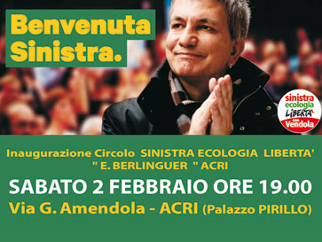 Questa sera, sabato, alle 19 è prevista l’inaugurazione del circolo di Sel alla presenza del segretario provinciale, Mario Melfi, dei candidati alla Camera, Ferdinando Aiello e Bruno Pascuzzo, di Angelo Broccolo, presidente regionale di Sel e di Giuseppe Giudiceandrea, assessore provinciale.