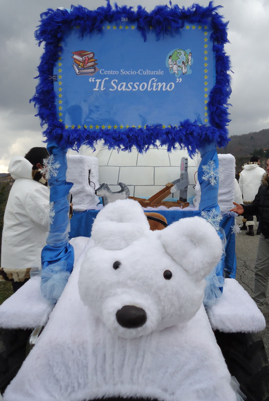 Tanti i bambini e i ragazzi partecipanti, che, con i loro candidi e morbidi costumi (realizzati da P. Chimento) hanno regalato, fra nuvole di coriandoli, saluti e sorrisi al caloroso pubblico, giunto per assistere alla sfilata; il tutto sulle note di coinvolgenti musiche nordiche, ma anche canzoni d’autore e canzonette (Hevia, R. Gaetano, E. Vianello). In trepidante attesa tutti i giovani del Sassolino che da giorni speravano in condizioni climatiche positive, ma anche genitori, familiari e tutte, ma proprio tutte le persone che in ogni forma e modo hanno contribuito alla realizzazione del carretto (l’igloo, il pinguino, la foca, la slitta col manichino, la coperta a forma di orso per il trattorino); un soddisfacente lavoro di gruppo voluto dal Sassolino che, il linea con il proprio motto dei cerchi concentrici, ha cercato di coinvolgere persone non soltanto della contrada, ma anche di realtà vicine (Montagnola, Settarie, Serralonga, Pertina, S. Giacomo, Acri centro), non disdegnando mai la collaborazione esterna, ma anzi facendone motivo d’orgoglio. Poter ammirare le piazze colme di gente… ognuno con i propri affanni, i propri problemi, ma per poche ore uniti dalla comune allegria è stata, per noi del Sassolino una emozione unica, da portare nel cuore per sempre, ringraziando, con gli occhi lucidi, le persone che ci hanno sostenuto e sperando di poter vivere, in futuro, tante altre piccole grandi avventure simili. La nostra motivazione: l’igloo è un piccola casa costruita con blocchi di ghiaccio, in un ambiente (il polo Nord), in cui le condizioni climatiche sono davvero avverse. La sua struttura è semplice, lineare (potrebbe sembrare anche spoglia), ma la contrario di quanto si può pensare esso è molto caldo al suo interno. L’apparenza, quindi, può ingannare. Così come l’igloo può sembrare spoglio e freddo all’esterno, allo stesso modo nel momento in cui incontriamo una persona (senza distinzione di sesso, nazionalità, estrazione sociale, credo religioso) che a prima vista può sembrare, fredda, chiusa, schiva o peggio antipatica, beh! Non dobbiamo fermarci all’apparenza… dobbiamo andare oltre, conoscerla meglio, scrutarla, e arrivare “all’essenza”, al nucleo del suo essere e, tante volte, potremmo anche avere delle belle e inaspettate sorprese, e trovare nel suo animo quel tepore che dapprima non avevamo messo in conto. A tutto ciò bisogna aggiungere che gli Eschimesi rappresentano una etnia unica, un popolo straordinario che ha fatto della sfida al freddo e alle intemperie motivo di vita quotidiana, riuscendo con stile, ma anche fortezza a sopravvivere e adattarsi in luoghi impervi. “L’intelligenza è la capacità di adattamento” scriveva Jean Piaget e gli Eschimesi hanno molto da insegnare ad una società, forse troppo modernizzata e assuefatta ai comfort quotidiani. Si può, quindi, vivere bene in ogni parte del mondo, purché nella coscienza di ognuno prevalga sempre e, comunque la dignità di essere uomini, oltre che l’amore e il rispetto immenso per tutto ciò che è vita. Si vive bene al Polo Nord! Non a caso, nel nostro carretto allegorico anche i pinguini, che vivono solo nell’Antartide, hanno deciso di trasferirsi nell’Artico.