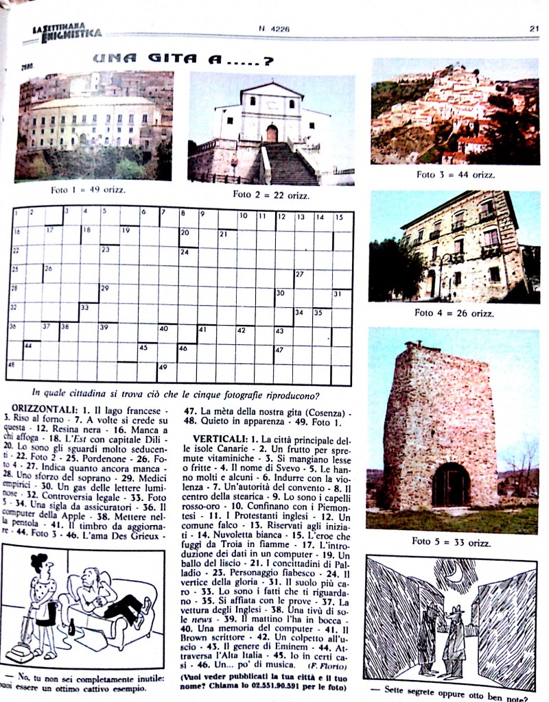 Il più famoso periodico italiano di enigmistica ha dedicato al territorio acrese la famosa rubrica “Una gita a…”, che presenta settimanalmente foto a colori di una importante località italiana. A pagina 21 sono pubblicate alcune foto di alcuni monumenti e un panorama di Acri. Le foto sono prive di didascalia perché il nome di questi luoghi è richiesto in alcune righe orizzontali e verticali per risolvere il cruciverba e scoprire quindi la meta della gita. Non resta che correre in edicola e cimentarsi in un cruciverba tutto “acrese”. Ora, non vi rovino il gioco, e vi lascio completare da soli il cruciverba!
