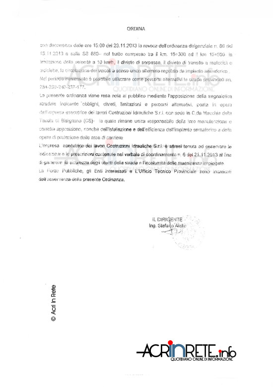 La comunicazione è stata data dalla Provincia di Cosenza, con la deliberazione dell'ufficio interessato. Il ritardo dei lavori è dovuto a diverse complicazioni nell'avanzamento degli stessi a causa soprattutto del cattivo tempo che da qualche giorno sta imperversando sull nostro territorio. Le fortissime pressione che negli ultimi giorni imperversano sui social network per lo stato pietoso del tratto alternativo, hanno spinto i tecnici ad attuare questa soluzione.
