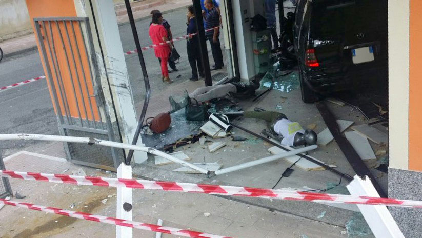 Brutto incidente avvenuto intorno alle 16.00 nei pressi dell’incrocio tra via Scervini e via De Vincenti, una Mercedes ML Nera guidata da un uomo, proveniente da Via Scervini, per cause ancora da accertare, dopo aver divelto la ringhiera che costeggia il marciapiede in via De Vincenti, è finito direttamente in un negozio di abbigliamento, dopo aver sfondato la vetrina.